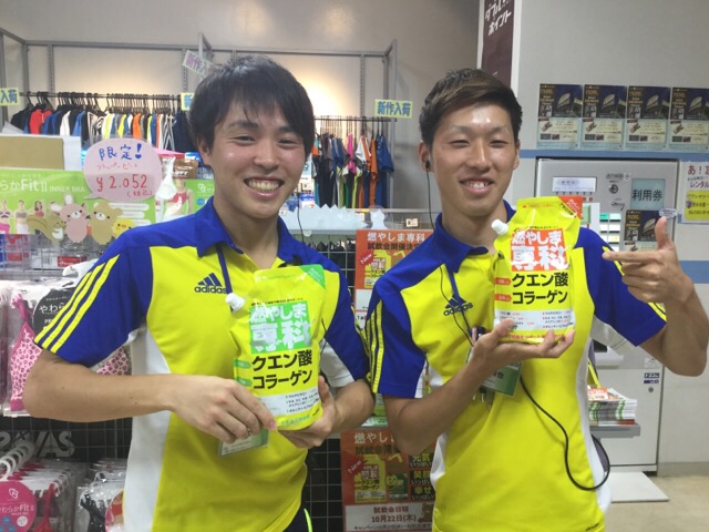 スタッフさんの写真になります。燃やしま専科とは、クエン酸、コラーゲン、マルチビタミン、ヒアルロン酸、食物繊維、カルシウム、グルコサミン等27種類の成分配合のスポーツ飲料です。運動中は勿論、日常的な摂取で健康サポート飲料です。