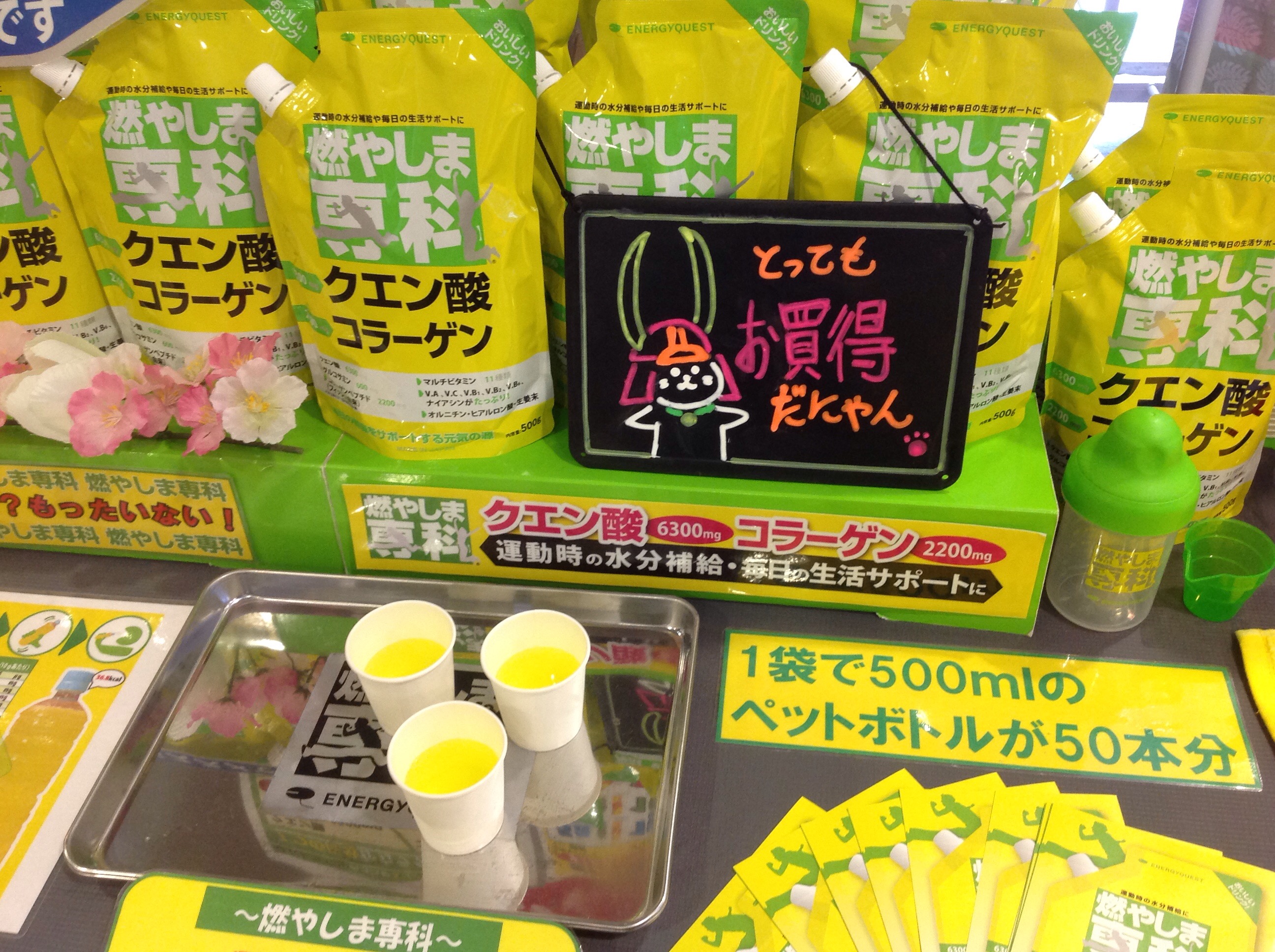 本日は滋賀県彦根市にありますスポーツクラブ、コパン健康倶楽部 彦根さんにお邪魔しています。ただいま、大人気クエン酸スポーツ飲料『燃やしま専科』の試飲会を絶賛開催中でございます。