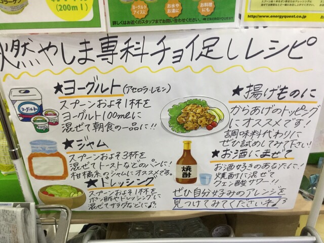 『燃やしま専科』はクエン酸、コラーゲン、オルニチン、グルコサミン、生姜末、食物繊維、カルシウム、ヒアルロン酸、ビタミン、ミネラルなど27種類の成分が入っているクエン酸粉末飲料です。水などに溶かして飲むだけでなく、ヨーグルトなどにかけても食べても、オススメです。今日のお客様の中には、スムージーに混ぜて毎朝飲んでる方もいらっしゃいました。皆さん色々な使い方がありました。「こんな使い方がある。」と言うお客様是非教えてください。