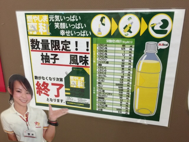 今日はルネサンス泉大津さんでのクエン酸飲料燃やしま専科の試飲会でした。今回は数量限定でのゆず風味も、定番のレモンに加えてのキャンペーンになります。