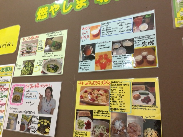 また栄養素が豊富に含まれていますので、栄養補給にも役立てれます。粉末になっているので、お水に溶かすだけでなく、お料理に使えたりもします。という事で、スタッフさん手書きの燃やしま専科を使っての料理のレシピです。手書きPOPありがとうございます。