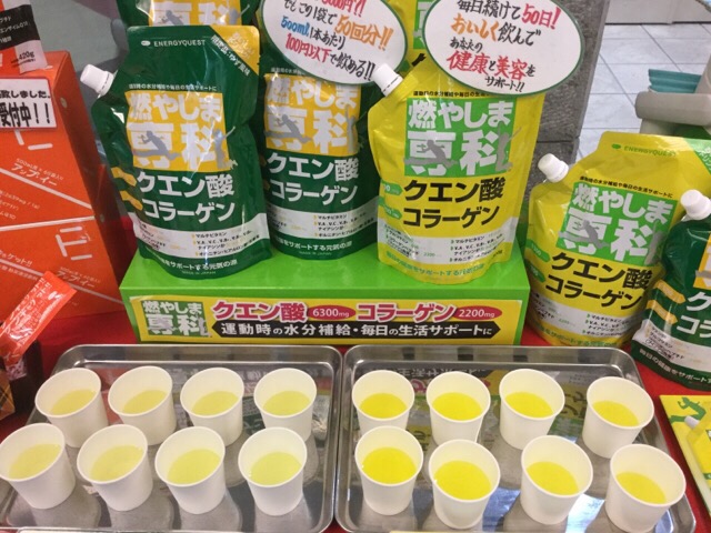 クエン酸飲料『燃やしま専科』はクエン酸にビタミン・ミネラル類、コラーゲン、ヒアルロン酸、グルコサミン、オルニチンなども全部で27種類の栄養素を配合。ゲンキとキレイのために皆様の健康と美容をサポートするドリンクです。