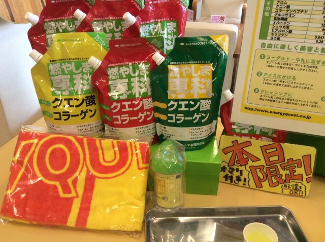 本日は神奈川県にあるロコ湘南店にて、クエン酸コラーゲン粉末スポーツ飲料の「燃やしま専科」の試飲会を開催しております。