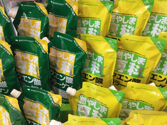 今回のオススメは『燃やしま専科』ゆず風味です。緑色の袋になります。去年人気だった商品の復刻になります。今回も数量限定で販売されている商品になります。『燃やしま専科』はクエン酸、コラーゲン、グルコサミン、オルニチン、生姜末、ヒアルロン酸、食物繊維、カルシウム、ビタミン、ミネラルなど27種類の成分配合です。こんな寒い日はホットで飲んでもオススメです。