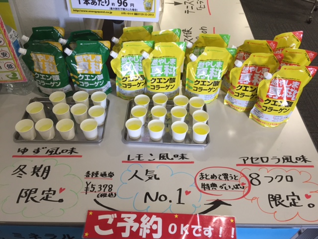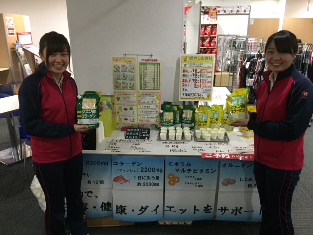 さんにて、クエン酸コラーゲン粉末飲料「燃やしま専科」の試飲販売