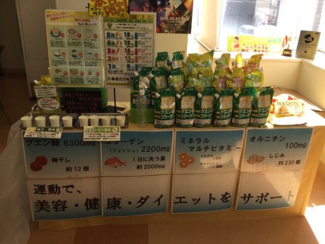 本日は埼玉県にあります、東武スポーツクラブみなみさくらい店でのクエン酸コラーゲン粉末スポーツドリンク【燃やしま専科】の試飲販売会です。燃やしま専科とはクエン酸とコラーゲン、さらにショウガの粉末など、27種類の栄養成分が入ったスポーツドリンクです。スポーツドリンクといっても運動しない日常生活で飲んでも全く問題ありません。むしろホットにするなどオススメです。