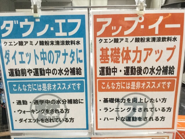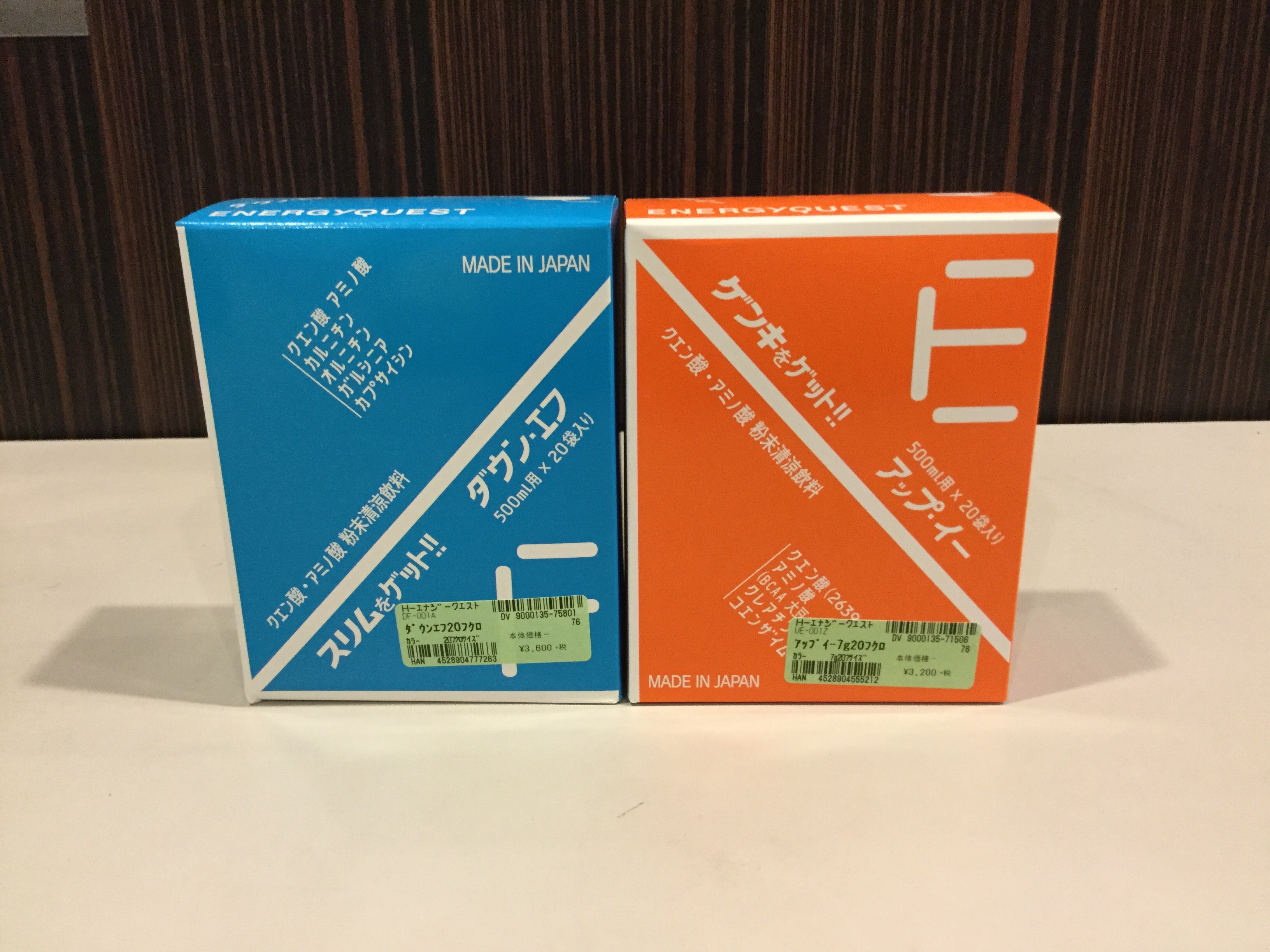 ゲンキをゲット『アップイー』スリムをゲット『ダウンエフ』。どちらもクエン酸アミノ酸粉末清涼飲料です。