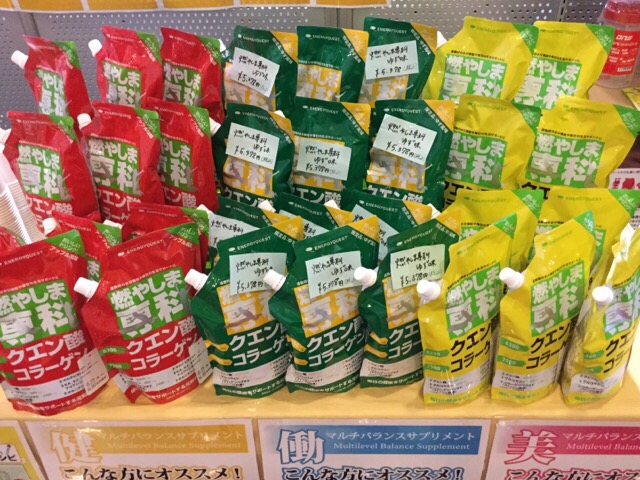 『燃やしま専科』はクエン酸、コラーゲンをはじめ、オルニチン、生姜末、グルコサミン、ビタミンミネラルなど27種類の成分配合の粉末スポーツドリンクです。水曜も好評を頂いたアップル風味もあります。赤がアップル風味、緑はゆず風味、黄色はレモン風味です。