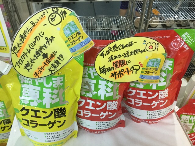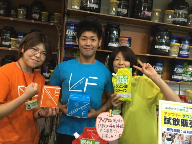そんなリライムフィットネスエリアにてクエン酸飲料アップイー・ダウンエフ・燃やしま専科の3種類同時試飲会開催をしてます。