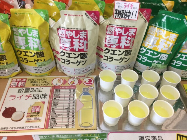 ロコスポーツ湘南店さんでも人気のクエン酸スポーツドリンク『燃やしま専科』。今年の夏は限定のライチ風味をラインナップに加えての販売会。スッキリ飲みやすいと大好評でした。試飲会は本日で最後ですが、お買い得なキャンペーンは明日の6月30日まで開催中です。まだ購入されていない方はお急ぎくださ~い!