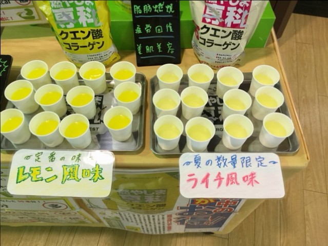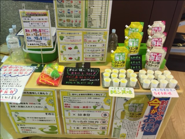て、クエン酸コラーゲン粉末飲料「燃やしま専科」の試飲販売会を開