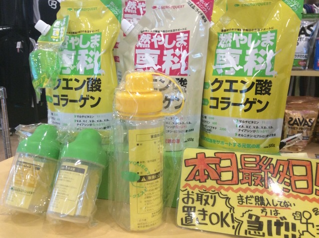 本日が試飲会最終日ですので、まだ試飲されていないお客様はこの機会にぜひクエン酸コラーゲン粉末スポーツドリンクの「燃やしま専科」を試飲してみてください。