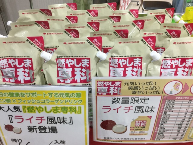 いつもの黄色い袋の燃やしま専科の横にある、クリーム色の袋が、ライチ風味の燃やしま専科です。クエン酸飲料ですので、酸味がある点はレモン風味と同じですが、レモン風味にはない、フルーティーな甘味が、ライチ風味にはあります。