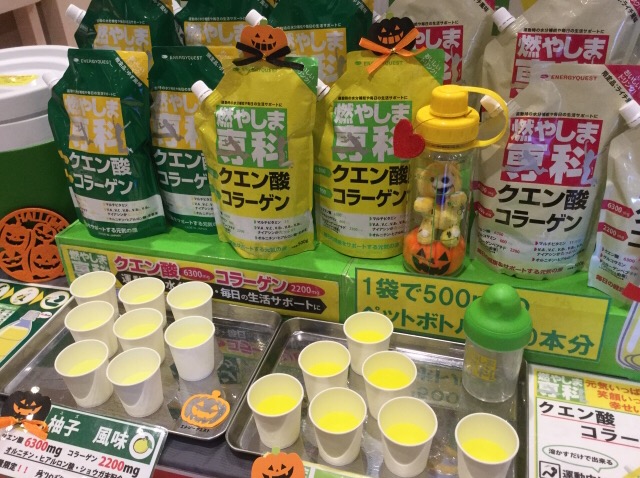 本日もハロウィン仮装のお客様でスタジオはとても賑やかでした。衣装からメイク、小物まで、それぞれのこだわりがあるようですね。そんな、皆様には是非、こだわりのスポーツドリンクがおススメです。こちらの店舗で人気のクエン酸飲料『燃やしま専科』は運動時にうれしい成分が詰まってます。定番のレモン風味に、この季節一番人気のゆず風味もおススメです。西日暮里店さんでは今月末の10月31日までお買い得なキャンペーン中です。この機会にお買い逃がしなく!