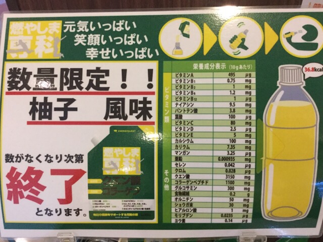大阪府での本日の試飲販売会はクエン酸コラーゲン粉末スポーツドリンクの燃やしま専科になります。