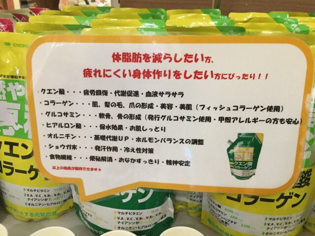 今月キャンペーンを行っていました、燃やしま専科には、クエン酸の他に、ミネラル・マルチビタミン・オルニチン・コラーゲン・ヒアルロン酸・グルコサミン・生姜末など、全27種類の栄養素が含まれています。