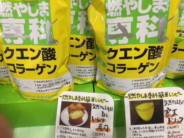 にて、クエン酸コラーゲン粉末飲料「燃やしま専科」の試飲販売会を