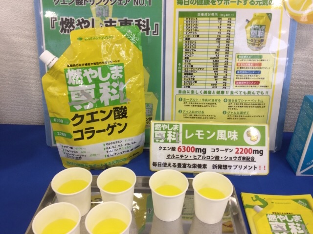 クエン酸ドリンク『燃やしま専科』はクエン酸にビタミン・ミネラル類を多く含み、コラーゲンやヒアルロン酸、グルコサミンやオルニチンなど27種類の栄養成分を配合した美容と健康をサポートするスポーツドリンクです。定番のレモン風味に加え、季節ごとの限定風味が楽しめるのも人気の秘密です。次はどんな風味が出るか楽しみですね。