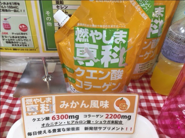 さて燃やしま専科とは、27種類の栄養がが配合されており、栄養が偏りがちな方や、健康に気を使われている方や、運動をする方などにオススメの商品です。運動時のスポーツドリンク代わりとして水分補給に使っていただくと、汗と一緒に出てしまう成分もその場で補給できますし、また、クエン酸回路も使えるので体も楽に動かせる要因の1つにもなります。だからこれを飲んでランニングしたからだからだ燃えるんだともよく言われます。500m l飲んでいただくと、クエン酸量は梅干しに換算すれば約6個分も摂れる内容量です。