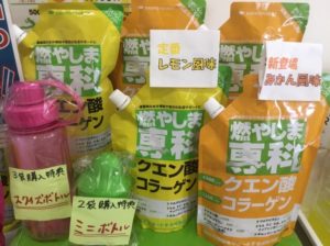 クエン酸ドリンク『燃やしま専科』はクエン酸にビタミン・ミネラル類を多く含み、コラーゲンやヒアルロン酸、グルコサミンやオルニチンなど27種類の栄養成分を配合した美容と健康をサポートするスポーツドリンクです。定番のレモン風味に加え、季節ごとの限定風味が楽しめるのも人気の秘密です。