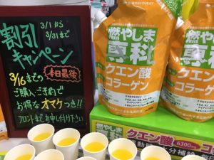 こちらの店舗は最近大幅にリニューアルされ、雰囲気が一新しましたが、変わらず多くのお客様が弊社商品を利用してくれています。今回は『燃やしま専科』の冬季限定のみかん風味が大人気でした。木場店さんでは3月31日までお買い得なキャンペーン中です。『燃やしま専科』に加え、アミノ酸も配合した『アップイー』と『ダウンエフ』もご用意しております。この機会に是非お買い求めください。