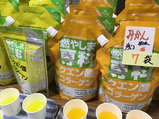 九州出張2日目もNASスポーツクラブ姪浜店さんにて「燃やしま専科」の試飲会を行いました。スポーツされる方や、運動される方におススメの「燃やしま専科」は全国のスポーツクラブで大人気のクエン酸飲料です。定番のレモン風味や限定風味なども楽しめますが、今年の冬はみかん風味が大人気ですね!ほんのり甘いみかん風味がスッキリ飲みやすいと大好評でした。そして大好評につき、限定のピーチ風味と共にみかん風味が完売です。次回はどんな風味が出るか楽しみにしていてくださいね。そして一番人気のレモン風味は、引き続きお買い求めやすい価格で販売中です。姪浜店さんでは4月19日までお買い得なキャンペーン中なので、この機会にお買い逃し無く~