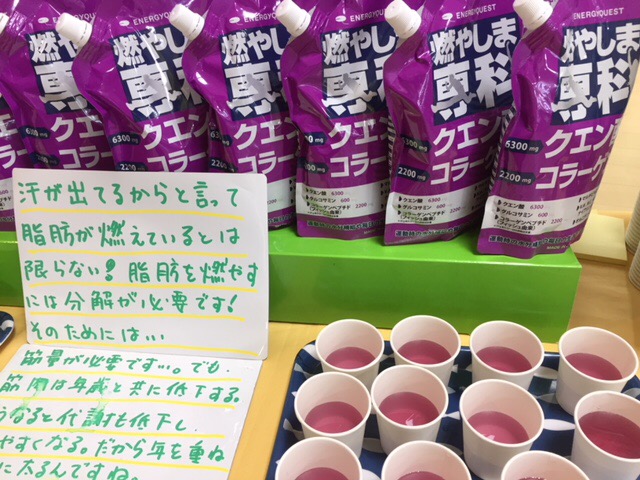 本日も、埼玉県さいたま市にあるスポーツクラブ、NAS武蔵浦和店にて、クエン酸ドリンク燃やしま専科の試飲販売会を開催しました。