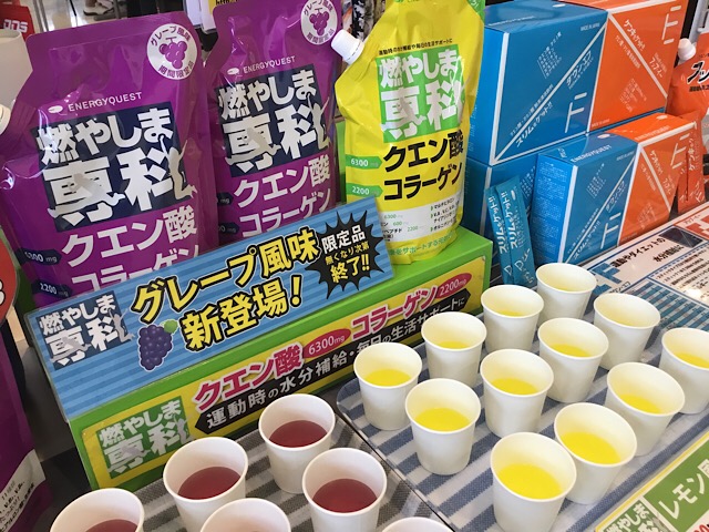 関西出張3日目はフィットネスクラブ・ティップネス宝塚店さんにお邪魔して試飲会を行いました。こちらの店舗でも多くのお客様が弊社商品を利用してくださっていますが、今回は『燃やしま専科』の夏季限定のグレープ風味が大好評!宝塚店さんでは6月30日までお買い得なキャンペーン中です。『燃やしま専科』の定番のレモン風味に加え、アミノ酸も配合した『アップイー』と『ダウンエフ』もご用意しております。この機会に是非お買い求めください。