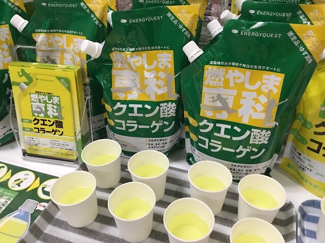 本日は神奈川県藤沢市にあるスポーツクラブ・ダンロップ藤沢店さんにて「燃やしま専科」の試飲会を行いました。全国のスポーツクラブで大人気のクエン酸飲料「燃やしま専科」は、運動中に必要な栄養素が盛りだくさんな上に、スッキリ飲める美味しいスポーツドリンクです!今回は定番のレモン風味に加え、人気の限定フレーバー・ゆず風味が復刻!試飲会は本日のみですが、10月31日までお買い得なキャンペーン中ですので、この機会に是非お買い求めください。