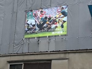 今日は兵庫県神戸市にあるスポーツジムでの試飲会です。神戸市では来年ラグビーワールドカップ開催されるようです。ラグビーワールドカップの広告を見つけました。