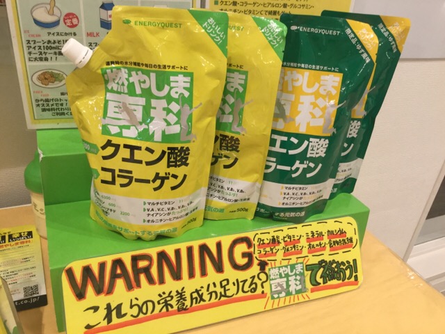 今週は燃やしませんかの商品の販売を行いました。「燃やしま専科』とは、クエン酸、コラーゲン、マルチビタミン、ミネラル、カルシウム、オルニチン、葉酸等、27種類の成分配合です。商品は粉末になっており、使いたい時に溶かすだけです。お水に溶かせばスポーツドリンク、そして、レモン代わりにお料理にも使える商品です。