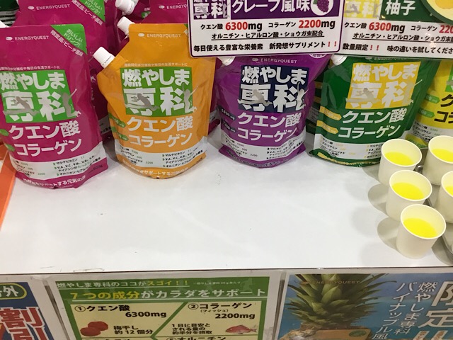 今週は都内のスポーツクラブにお邪魔しました。こちらの店舗でも日本全国のスポーツクラブで大人気の『アップイー』『ダウンエフ』『燃やしま専科』の愛飲者さんが多くいらっしゃいます。燃やしま専科は定番のレモン風味に加え、春夏新作のパイナップル風味が新登場しました。甘みが強い香りにさっぱりタイプの口当たりと、これからの時期にはピッタリのフレーバーとなっております。回復系のアップイーと燃焼系のダウンエフも一緒に是非この機会にお試し下さい。