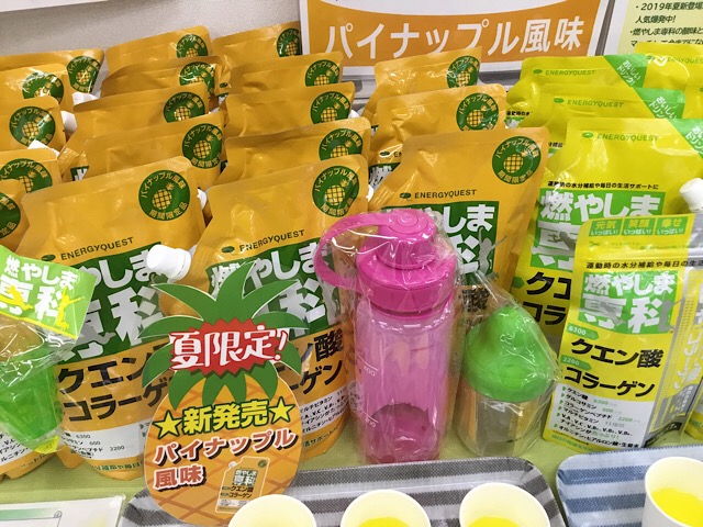 今回のスポーツジムでは、初のお披露目となったパイナップル風味の燃やしま専科ですが、定番のレモン風味とは少し違い、酸味と甘みも少し感じ飲むとパイナップルの風味が広がり、お客様に大変好評でした。