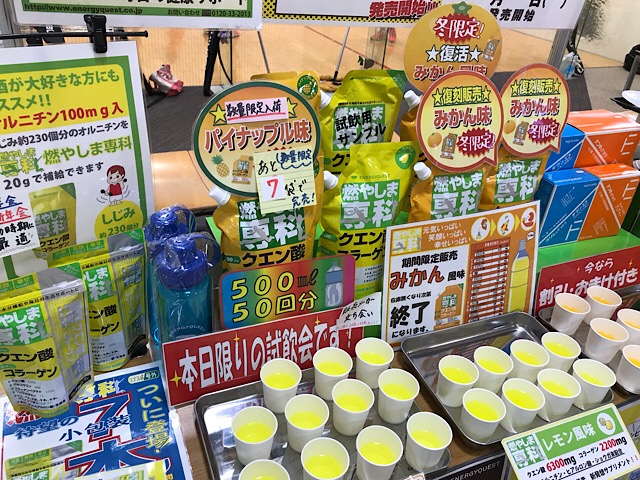 今週は都内のスポーツクラブにお邪魔しました。こちらの店舗でも日本全国のスポーツクラブで大人気の『アップイー』『ダウンエフ』『燃やしま専科』の愛飲者さんが多くいらっしゃいます。燃やしま専科は定番のレモン風味に加え、冬限定のみかん風味が再登場しました。甘みも感じやすいタイプなので酸っぱいクエン酸が苦手な方にオススメです。レモンとミックスさせても美味しく飲むことが出来ます。寒くなるこれからの時期にホットで飲んでもピッタリのフレーバーとなっておりますので、回復系のアップイーと燃焼系のダウンエフも一緒に是非この機会にお試し下さい。