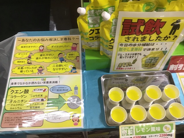 今週は北関東のスポーツクラブにお邪魔しました。こちらの店舗でも日本全国のスポーツクラブで大人気の『燃やしま専科』の愛飲者さんが多くいらっしゃいます。燃やしま専科は定番のレモン風味に加え、冬限定のみかん風味が再登場しました。甘みも感じやすいタイプなので酸っぱいクエン酸が苦手な方にオススメです。レモンとミックスさせても美味しく飲むことが出来ます。寒くなるこれからの時期にホットで飲んでもピッタリのフレーバーとなっておりますので、是非この機会にお試し下さい。