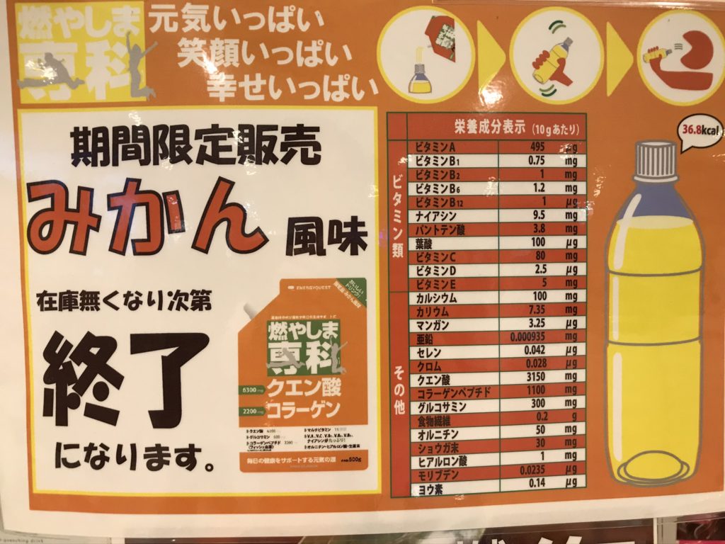 『燃やしま専科』とは、クエン酸、コラーゲン、マルチビタミン、ミネラル、カルシウム、オルニチン、葉酸等、27種類の成分配合です。商品は粉末になっており、使いたい時に溶かすだけです。お水に溶かせばスポーツドリンク、そして、レモン代わりにお料理にも使える商品です。汗を沢山かきたい方や、いつもより元気になりたい方にオススメです。クエン酸ですので、疲れていると少し酸っぱく感じます。