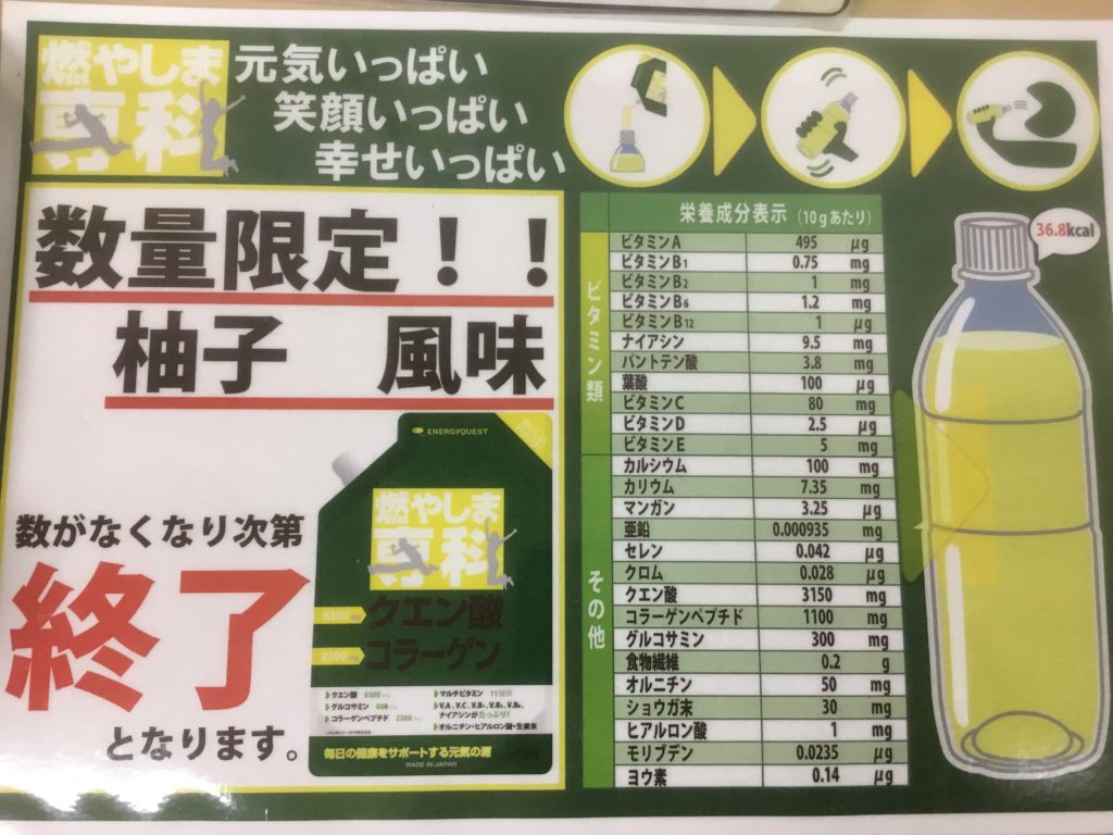 27種類の成分 今日は栃木県に来ています。 今日も10月後半とは思えないほど 暖かくなりましたね。 そんな今日は運動日和となりました。 そんな運動するときに飲んでもらいたい クエン酸ドリンク燃やしま専科の試飲会を 行なっ…