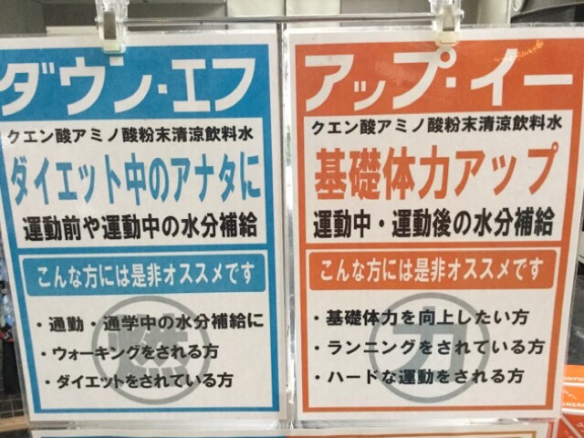 運動中などの水分補給 今日から関西方面に出張でやってきました。出張は半年ぶりで関西方面に来たのは1年以上前になります。久々の出張で初日に試飲会にきたのは大阪府にあるスポーツクラブです。紹介してきたのは『アップイー』『ダウ…
