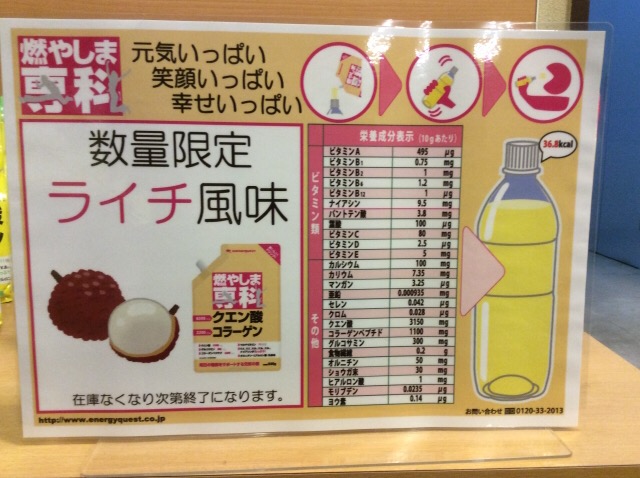 夏限定のライチ風味 本日も、東京都世田谷区にあるNAS 芦花公園店にて、クエン酸コラー ゲン粉末飲料「燃やしま専科」の試飲販売会を開催しました。 とても静かで落ち着いている雰囲気の中、自分のトレーニングに集中 出来る店舗…