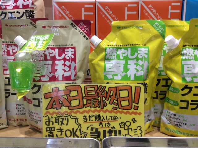 日常での水分補給にもオススメできる粉末スポーツドリンク 本日は先週に引き続き、神奈川県にあるスポーツクラブにてクエン酸コラーゲン粉末スポーツ飲料の「燃やしま専科」と、クエン酸アミノ酸粉末スポーツドリンクの「アップイー」、…