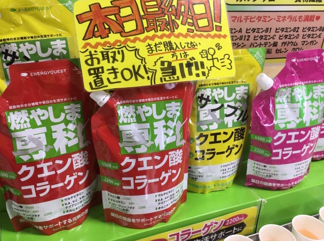 健康な生活にクエン酸ドリンク 本日はのスポーツクラブにてクエン酸コラーゲン粉末ドリンク「燃やしま専科」の試飲会を開催しました。今回はザ・スポーツクラブと言うよりは心身共に健やかな毎日を過ごす為の健康増進の総合施設でした。…