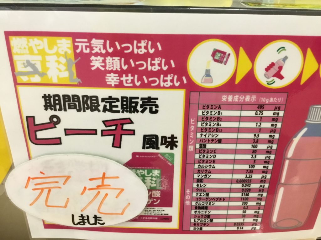 大好評ピーチ風味は完売しました 本日も愛知県にある ルネサンス名古屋熱田店さんで クエン酸粉末タイプのスポーツドリンク 『燃やしま専科』の試飲会を開催しています。 大好評の限定ピーチ風味は、おかげさまで完売しました。 あ…