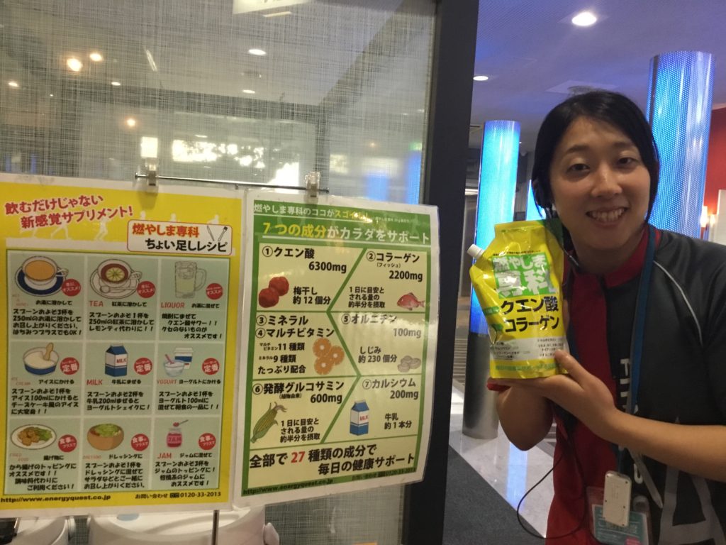 宮前平で試飲会中 本日は神奈川県にあるスポーツクラブティップネス宮前平店にて、クエン酸コラーゲン粉末スポーツドリンクの「燃やしま専科」と、クエン酸アミノ酸粉末スポーツドリンクの「アップイー」、「ダウンエフ」の試飲会を開催…