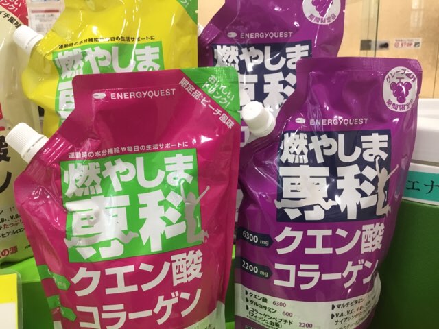 グレープ風味初登場 本日は東京都にあるスポーツクラブにて、クエン酸コラーゲン粉末スポーツドリンクの「燃やしま専科」と、クエン酸アミノ酸粉末スポーツドリンクの「アップイー」、「ダウンエフ」の試飲会を開催しております。 広島…