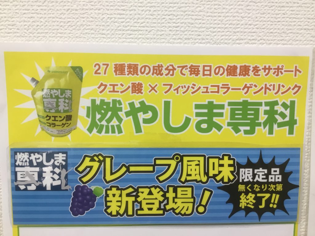グレープ風味新登場 本日は東京都にあるスポーツクラブにて、クエン酸コラーゲン粉末スポーツドリンクの「燃やしま専科」と、クエン酸アミノ酸粉末スポーツドリンクの「アップイー」、「ダウンエフ」の試飲会を開催しております。 今日…