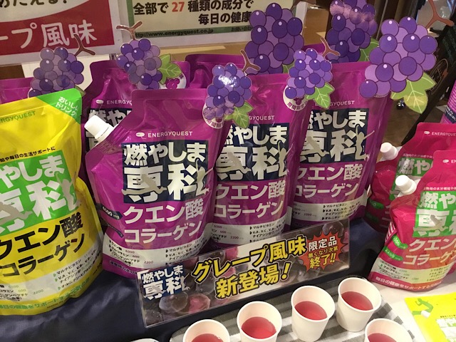 グレープ風味間も無く完売 本日は神奈川県にあるスポーツクラブにて、クエン酸コラーゲン粉末スポーツドリンクの「燃やしま専科」の試飲会を開催しております。 さて、本日は神奈川県にあるスポーツクラブにて試飲会を開催しております…