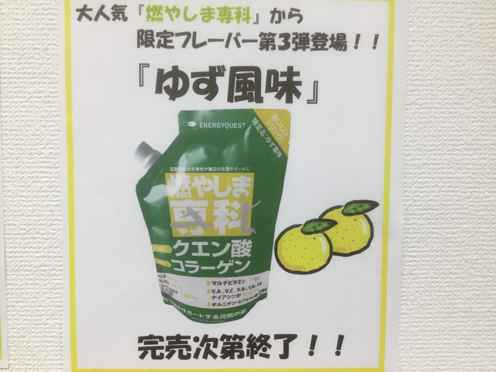 今年も復刻のゆず風味が人気! 本日は神奈川県内にあるスポーツクラブにて試飲会を行いました。こちらの店舗は弊社商品であるクエン酸飲料「燃やしま専科」を愛飲されているお客様が多く、今回の試飲販売会も大好評です。そしてついに今…