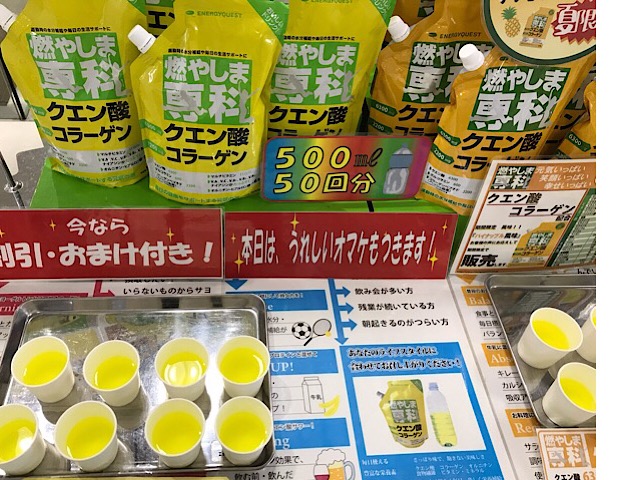 クエン酸が大好評 今週は静岡県にあるスポーツクラブさんでクエンドリンク『燃やしま専科』の試飲会を開催してきました。 この燃やしま専科には、クエン酸、コラーゲン、カルシウム、グルコサミン、ビタミン、ミネラル、オルニチン、生…