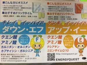 レッスン中、レッスン前後はもちろんですが、私は食事中やマラソン中にもいつもエナジークエストのアップ・イーを長らく愛飲しており、生活の中で欠かせないドリンクです。