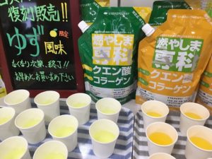 復刻のゆず風味!! 関西出張最終日は兵庫県にあるスポーツクラブにてクエン酸飲料『燃やしま専科』の試飲会を行いました。こちらでも早速、復刻販売のゆず風味が大好評販売中です。冬の新定番となったみかん風味も話題になりましたが、…